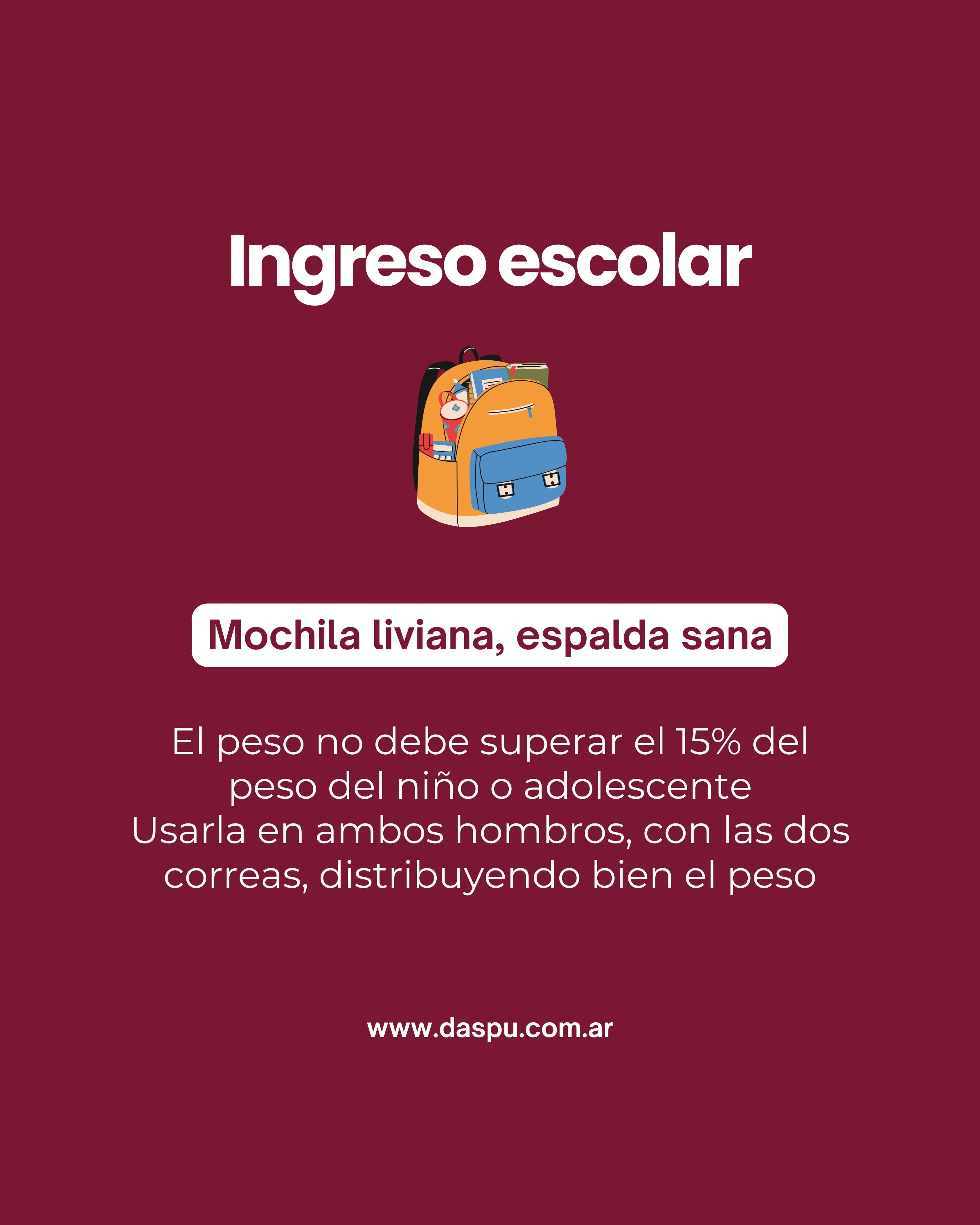 Cuidar el peso de la mochila es fundamental: se recomienda que no supere el 15% del peso corporal y que se utilice correctamente, con ambas correas, para distribuir mejor la carga.